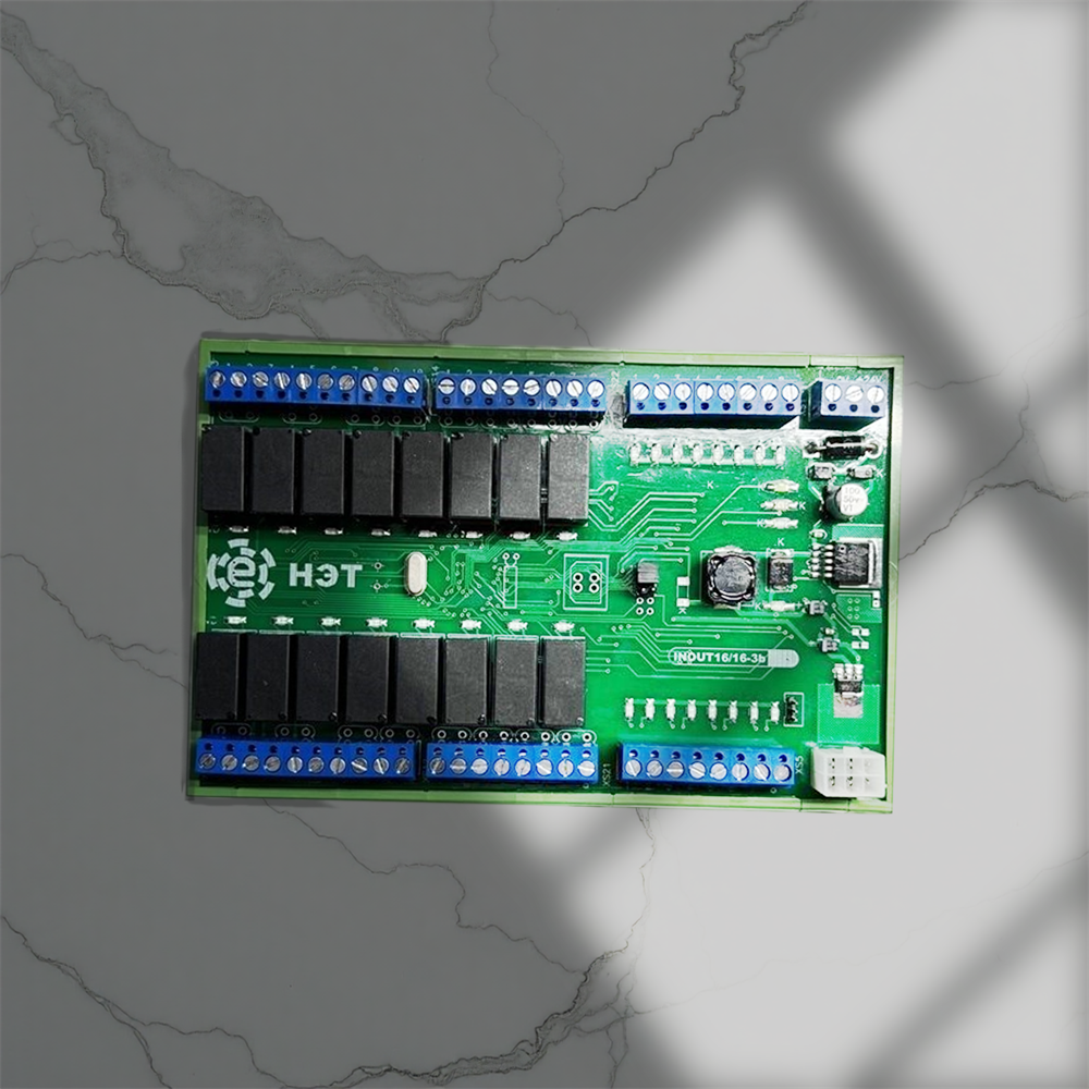 В плате находиться 16 реле с нагрузочной способностью ~110В 1 А, 4 шт. NO+NC, 12 шт. NO.